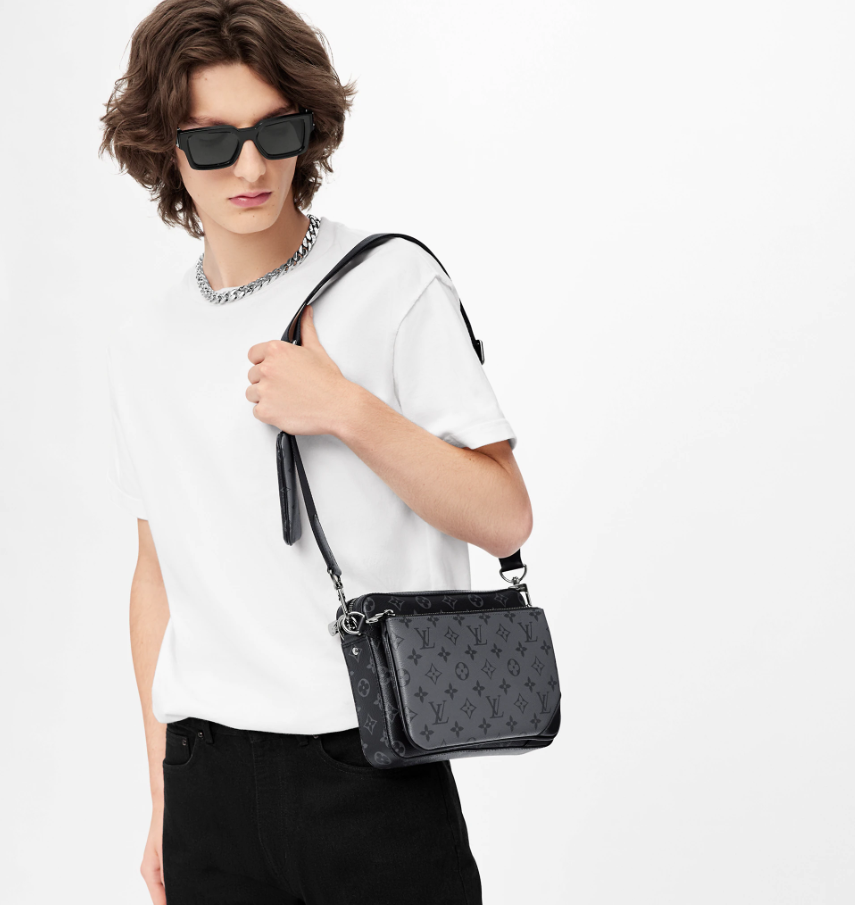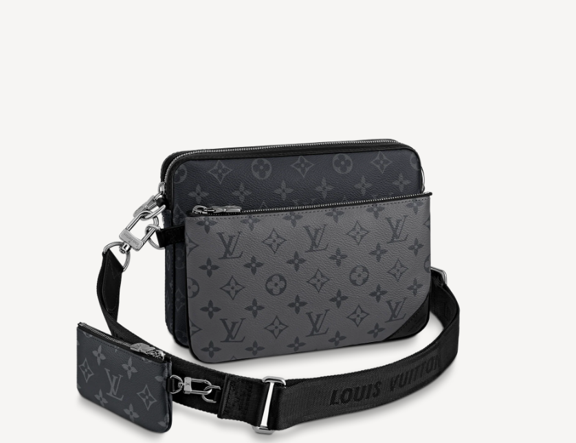 Ce sac Messenger Trio se pare de la toile Monogram Éclipse et de sa version inversée, la toile Monogram Éclipse Reverse. Décliné dans une palette de gris, le motif caractéristique ton sur ton met en valeur les lignes de ce modèle hybride. Bien plus qu’un sac porté croisé classique, il comporte une poche avec fermeture à glissière et un porte-monnaie attaché à la bandoulière, tous deux amovibles.
